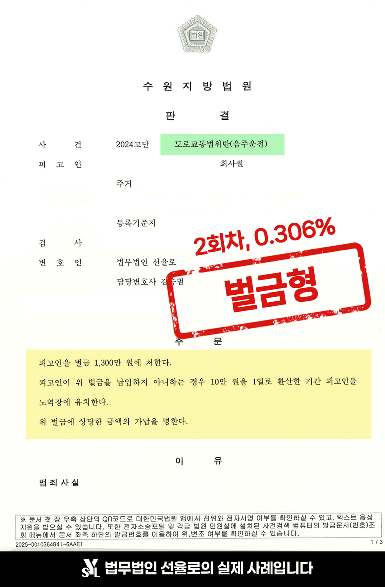🚗 혈중알코올농도 0.306%로 음주운전 2회차 적발, 벌금형 선처