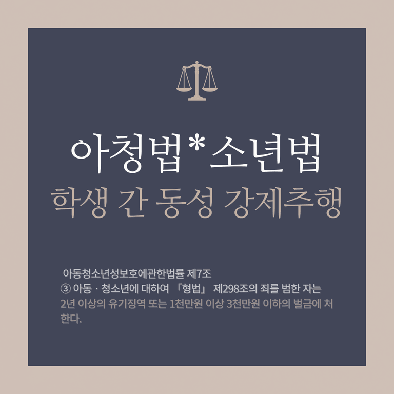 의뢰인은 자녀는 학교 기숙사에서 생활하고 있는데, 친구들과 어울리던 중 같은 성별의 친구의 바지를 내리며 성적인 신체부위를 노출시켰던 것으로 학생 간 동성강제추행 피소되었다고 합니다.