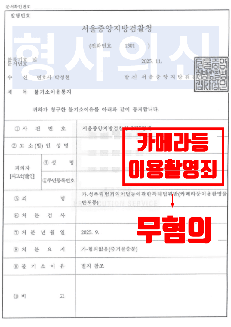 서울중앙지방검찰청은 법률사무소 유(唯)의 형사전문변호사의 주장 내용을 전부 받아들여 무혐의(증거불충분) 처분을 하였습니다.