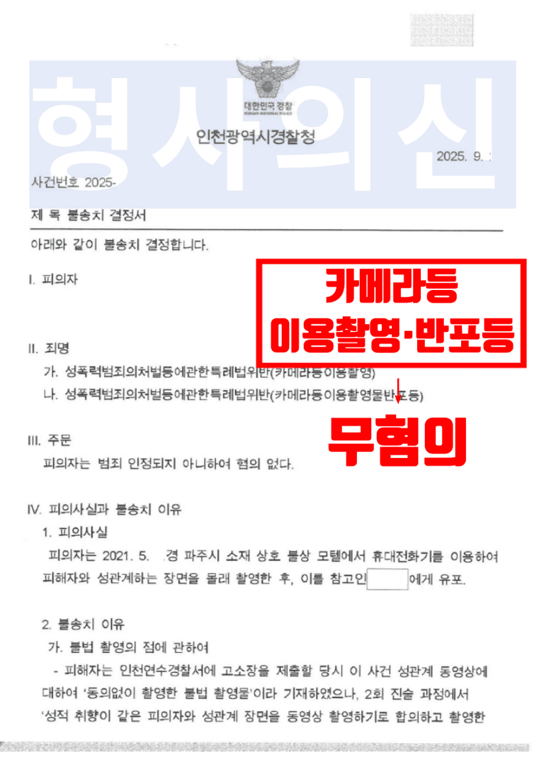 인천광역시경찰청 수사관은 법률사무소 유(唯)의 형사전문변호사의 주장 및 제출한 변호인의견서를 받아들여 촬영혐의와 제공혐의가 촬영대상자의 의사에 반하여 제공되었다고 보기 어렵다는 점을 이유로‘불송치(혐의없음)’를 선고하였습니다.