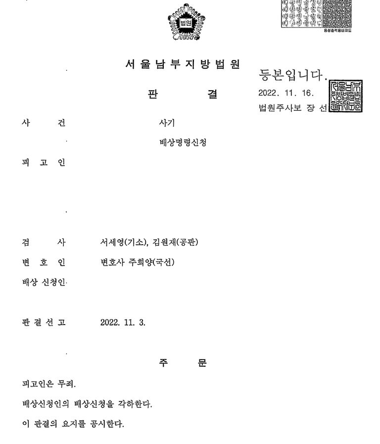 법원은 변호측 논리를 수용해, 피고인에 대한 무죄 선고와 함께 배상신청도 각하했습니다. 건실하게 경제활동을 하려다가 범죄자로 몰렸던 피고인은 억울한 누명을 벗을 수 있었습니다.