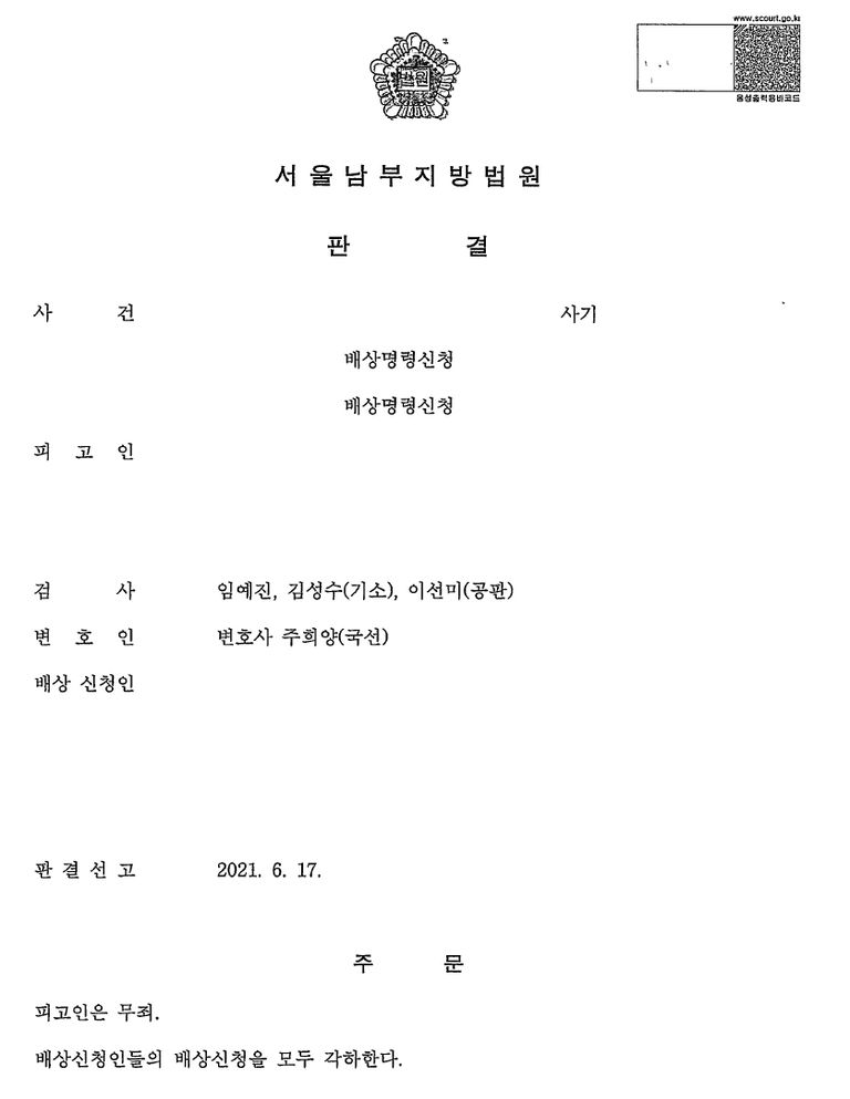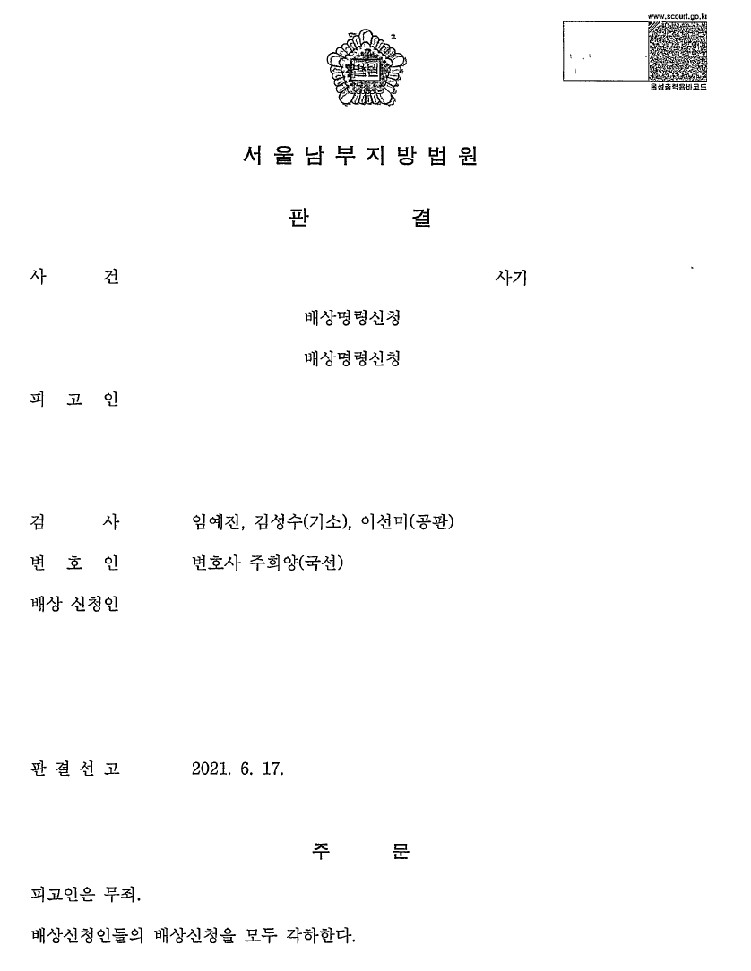 그 결과, 피고인은 무죄를 선고받았으며, 피해자들의 배상 신청 역시 모두 각하되었습니다.