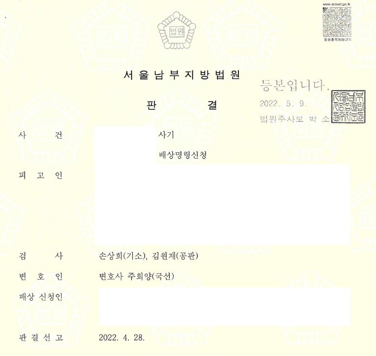 법원은 변호 측 주장을 수용해 “피고인이 현금수거책 역할을 한 사실은 인정되지만, 공모의 정황이 없고 주도적 가담자로 보기에 부족하다”며 형사소송법 제325조 후단에 따라 무죄 판결을 선고하고 배상신청을 각하했습니다.