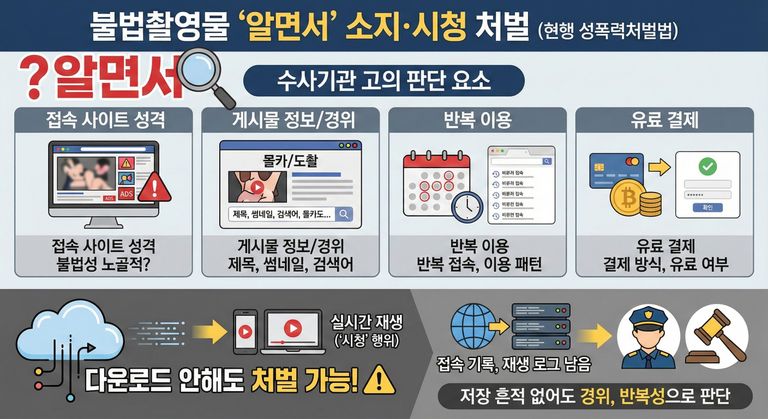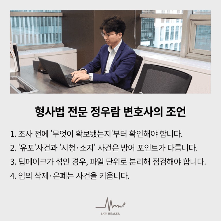 반면 시청·소지 사안에서는 '알면서'의 성립 여부, 접속 경위, 반복성, 저장·다운로드·캐시 흔적, 딥페이크와의 혼재 여부가 핵심입니다.