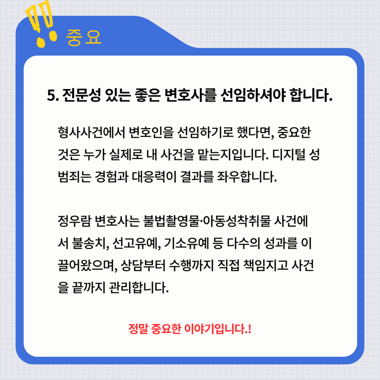 5. 전문성 있는 좋은 변호사를 선임하셔야 합니다.