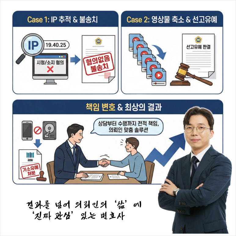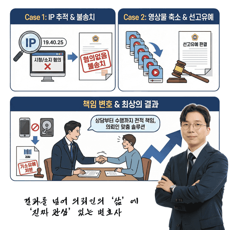 3) 불법촬영물, 아동성착취물 소지가 문제된 사안에서 기소유예의 불기소처분을 받아내는 등 다수의 성공사례를 보유하고 있으며,
