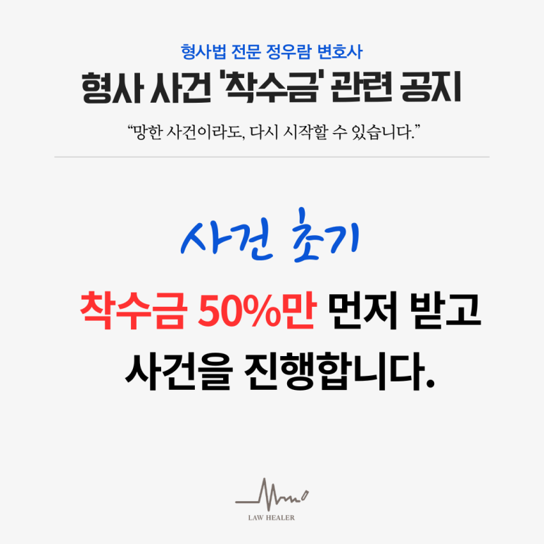 정우람 변호사는 형사사건에 한해 착수금 50%만 먼저 받고 사건을 진행합니다. 나머지는 사건이 종결된 뒤 정산합니다.