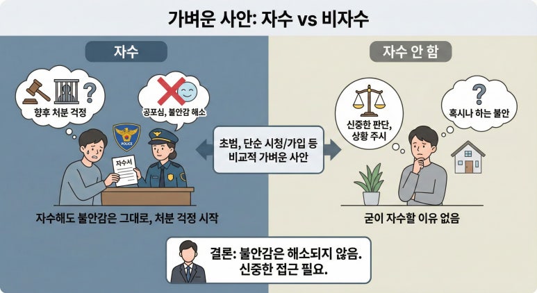 자수를 했다고 하여 공포심, 불안감, 두려움이 그대로 해소되는 것은 아니고, 자수를 하면 자수하는대로 향후의 처분에 대해 걱정을 하게 되기 때문입니다.