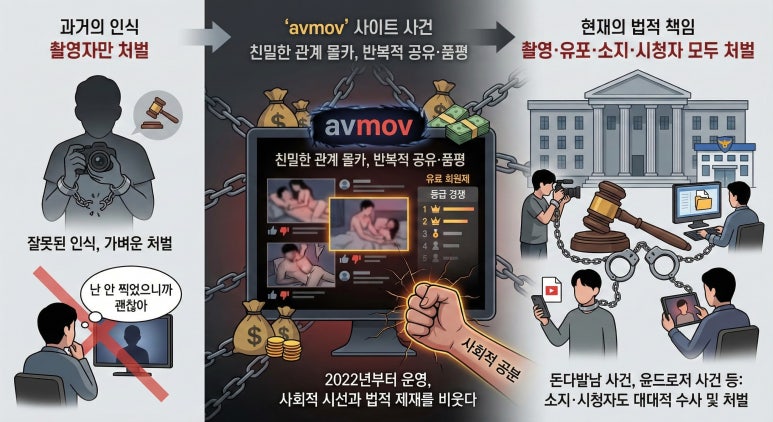 특히 디지털 성범죄 영역, 불법촬영물 관련 범죄영역에서 화두가 되고 있는 'avmov' 사이트 사건의 경우, 친밀한 관계에 있는 피해자를 상대로 한 몰래촬영 영상이 반복적으로 공유·품평되고, 유료 회원제와 등급 경쟁을 통해 수익이 만들어져왔으며,