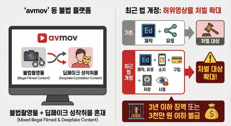 avmov와 같은 불법 유통 플랫폼에는 불법촬영물뿐만 아니라 딥페이크 성착취물(허위영상물)이 섞여 있는 경우가 많습니다.