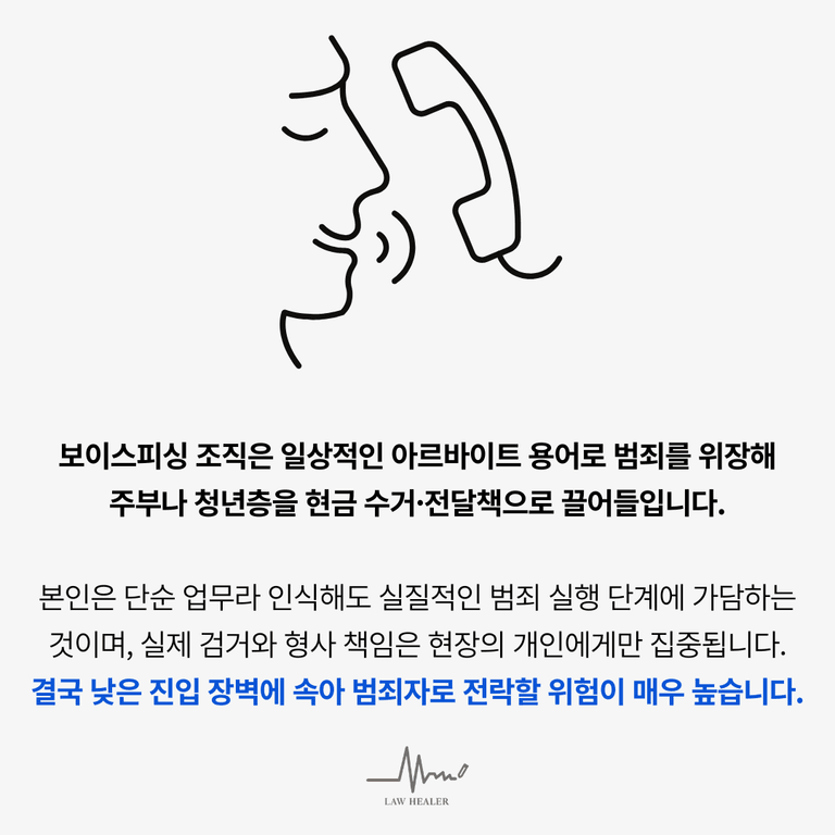 그러나 이 단계부터는 단순한 아르바이트가 아니라, 형사 책임이 문제 되는 국면으로 전환될 수 있으며, 경우에 따라서는 범죄 가담자로 판단될 위험이 발생합니다.