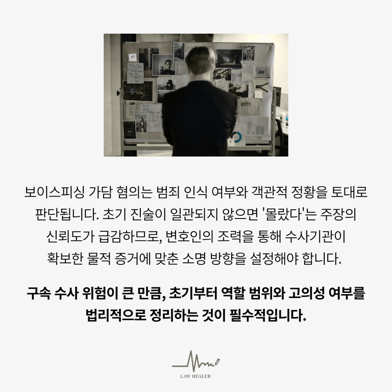 보이스피싱은 사회 전반의 금융 신뢰를 무너뜨리고 다수의 피해자를 양산하는 범죄입니다. 이러한 범죄의 특성과 파장 때문에, 수사기관은 '돈을 옮겼는지'보다 그 행위가 범죄에 어떤 영향을 미쳤는지를 중심으로 판단합니다.