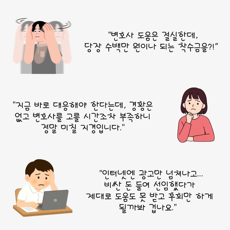 긴급 대응 이후에도 변호사 선임 및 조력이 필요한 상황에서, 비용 부담 때문에 대응이 늦어지는 경우 사건은 오히려 더 위험해질 수 있습니다.