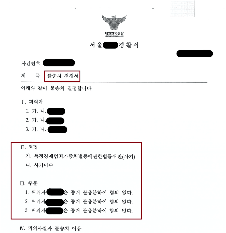 ✔ 결국, 의뢰인이 투자금을 갚지 못하였으나 이는 민사사안일 뿐 사기죄가 성립하지 않는다는 이유로 불송치(혐의없음) 라는 결과를 이끌어 낼 수 있었습니다.