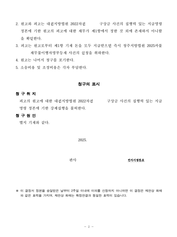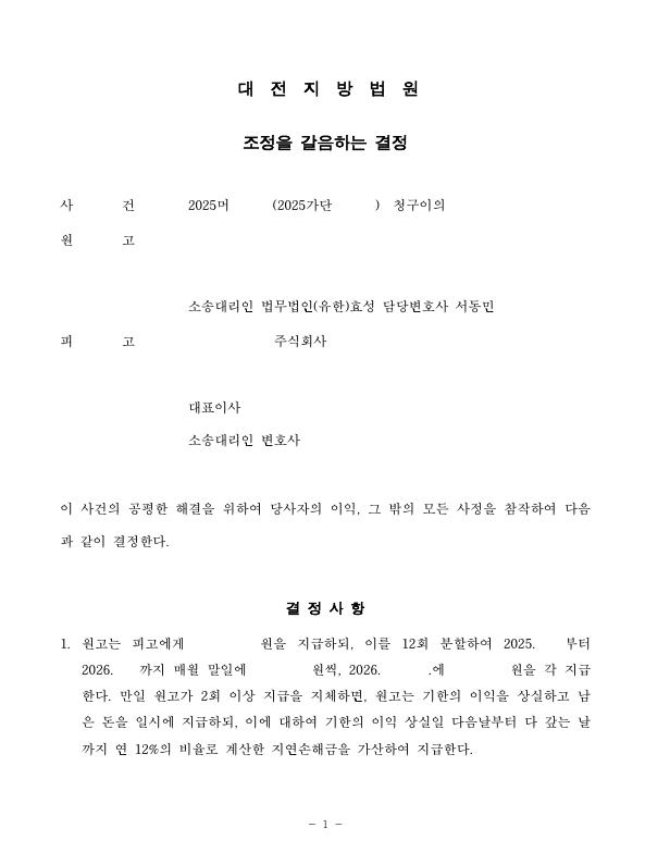 저는 즉각 청구이의의 소를 제기한 후 조정을 요청하였고 법원은 의뢰인이 채무액을 분납하고 피고는 강제집행을 해제하기로 하는 강제조정을 내려 확정되었습니다.