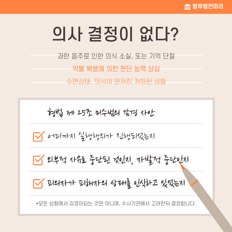 그렇다면, 미수범에게는 어떤 처벌이 주어지는 걸까요? 형법 제25조에는 ‘미수범의 형은 기수범보다 감경할 수 있다’고 적혀있습니다. 다만, 모든 상황에서 감경이 되는 것은 아니며, 수사 기관에서 아래의 조건들을 고려한 뒤 결정하게 되는 사안이니 참고 부탁드립니다.