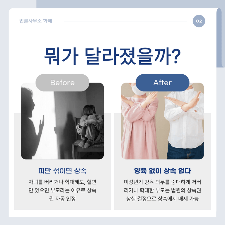 하지만 이제는 다릅니다. 자녀를 제대로 키우지 않은 부모, 부모로서의 의무를 저버린 부모는 상속받을 수 없습니다. 단순히 피를 나눴다는 이유만으로는 더 이상 권리를 주장할 수 없게 된 거죠. 그게 바로 구하라법입니다.