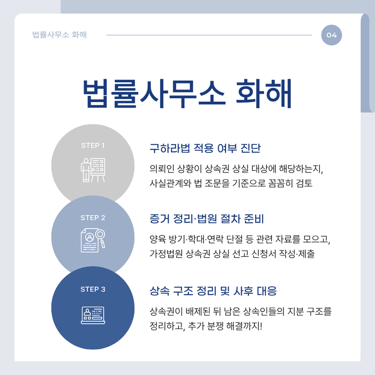 그리고 '부모니까 당연히'라는 말로 억울한 일을 당하지 않도록, 진정으로 책임을 다한 가족이 보호받을 수 있도록 저희 법률사무소 화해가 함께하겠습니다. 혼자 고민하지 마시고, 구체적인 사실관계에 따라 구하라법을 어떻게 활용할 수 있을지 상담을 통해 확인해 보세요.