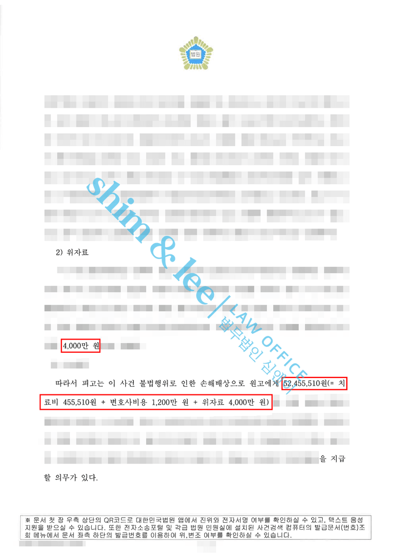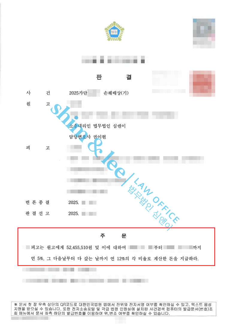 - 오늘의 사례는 민사 소장 작성부터 반박 서면 제출에 이르기까지 심앤이의 전문적인 조력이 재판부를 설득해 손해배상금 5,245만 원이 인용될 수 있었던 사건이었습니다.