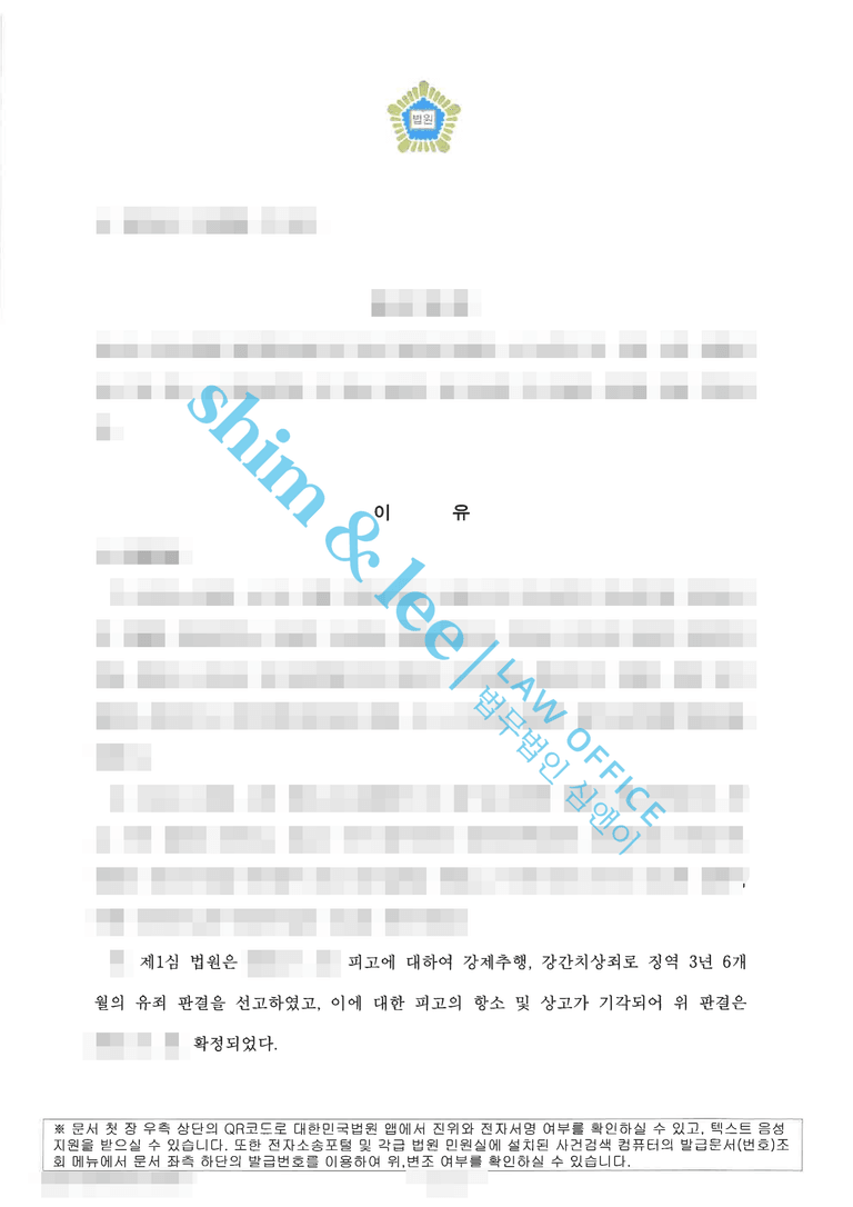 - 의뢰인은 사건 직후 변호사를 선임하여 형사절차를 진행하였고, 가해자는 1심 재판에서 징역 3년 6개월, 성폭력 치료강의 40시간, 아동·청소년 관련 기관 등 취업제한 3년을 선고받았습니다. 그러나 가해자가 판결에 불복하여 항소함에 따라 사건은 항소심(2심)으로 넘어갔고, 심앤이는 어렵게 유죄 판단을 받아낸 만큼 항소심에서 결과가 번복되지 않도록 모든 공판에 직접 출석하여 피해자의 입장을 재판부에 전달하고 양질의 변호사 의견서를 제출하였습니다. 가해자는 끝까지 혐의를 부인하고 무죄를 주장하였지만 항소심 재판부는 가해자의 항소를 기각하고 1심 판결을 유지하였고, 가해자는 법정에서 구속되었습니다. 이후 의뢰인은 민사상 손해배상을 청구하고자 다시 한 번 심앤이를 찾아주셨습니다.