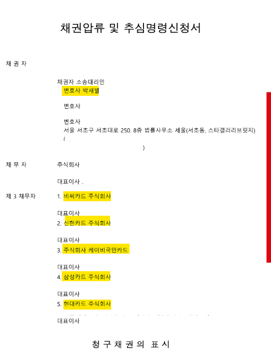 대표적인 카드사인 비씨카드, 신한카드, 케이비국민카드, 현대카드를 특정하여 채권압류 및 추심명령신청에 나아감
