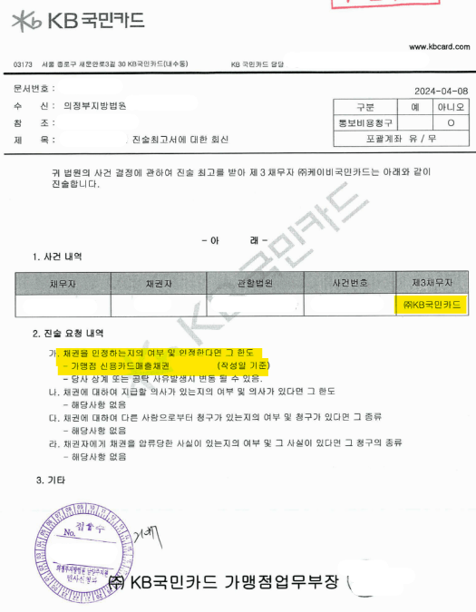 이후 케이비국민카드에서 추심가능한 금액을 확인할 수 있는 진술서를 회신하여 주었음