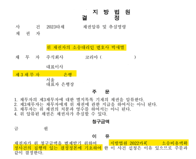 사건 접수된지 약 일주일만에 채권압류 및 추심명령결정을 받음