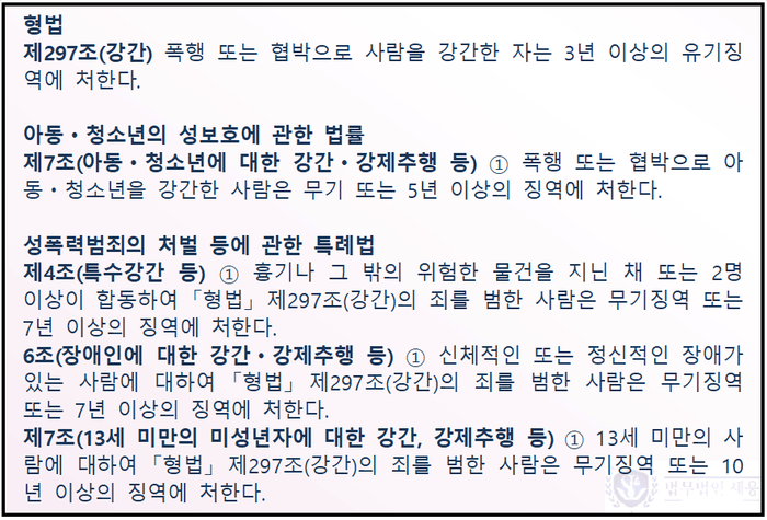 강간죄는 폭행이나 협박을 수단으로 상대방의 의사에 반하여 강제로 성관계를 가지는 경우에 성립하는 죄로 법정형(법에 정해진 처벌의 종류와 범위)이 3년 이상의 징역으로 벌금형이 불가능한 범죄입니다. 만일 2인 이상이 함께 범행을 하거나 흉기 등을 사용한 경우, 피해자가 장애인 또는 아동·청소년인 경우에는 형량이 훨씬 더 무거워집니다. 뿐만 아니라 유죄가 인정되는 경우 최소 15년의 신상정보등록 대상자가 되고, 신상정보가 인터넷이나 우편물을 통해 공개·고지 될 수도 있습니다.