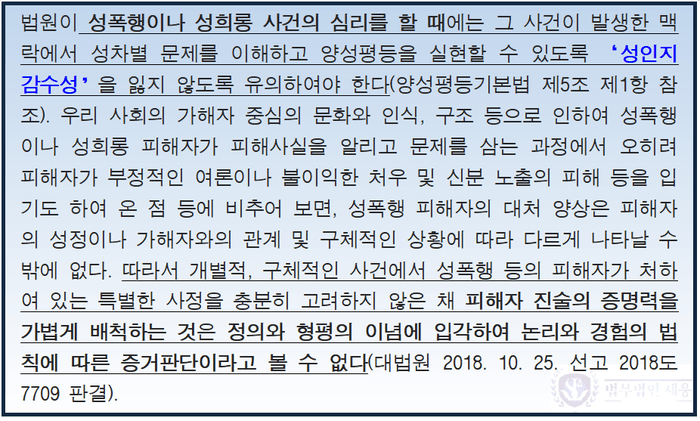그런데 대법원에서 성범죄 사건을 심리할 때에는 성인지 감수성을 고려하여 피해자 진술의 증명력을 쉽게 배척해서는 안 된다고 판시한 이후 수사기관과 법원에서는 피해자 진술을 근거로 유죄 판단을 하는 경우가 매우 많아졌습니다. 법조계 일각에서는 성범죄 사건은 무죄추정의 원칙이 아닌 유죄추정의 원칙이 적용된다는 말까지 나올 정도입니다.