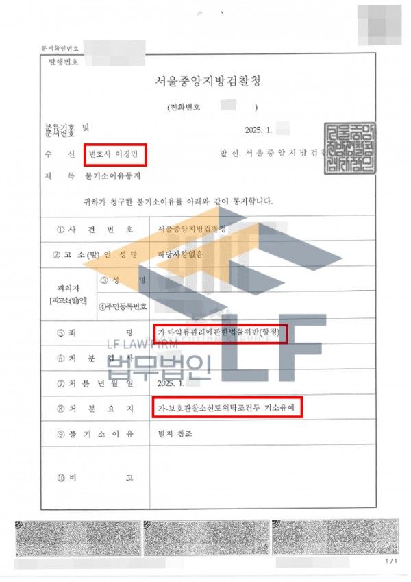 마지막으로 본변호인은 피의자 조사에 의뢰인과 동석하여, 의뢰인이 상습적 투약자가 아닌 점, 우발적인 상황에서 엑스터시를 투약했던 점, 의뢰인이 범행을 저지른 것에 대해 진정으로 반성하고 있는 점, 재범 방지에 대한 의뢰인의 의지가 확고한 점, 의뢰인의 지지체계가 분명하여 사회 복귀 가능성이 높은 점, 법리적인 근거로 초범인 경우 기소유예 처분이 적절하다는 점을 주장하며, 의뢰인에 기소유예 처분을 내려줄 것을 검찰에 호소했습니다.