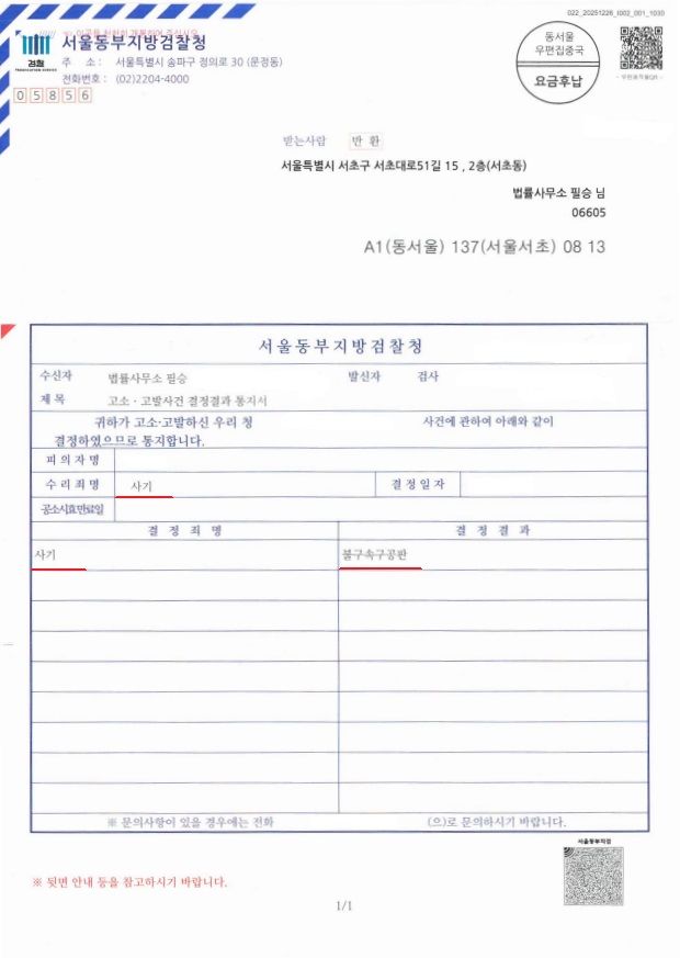 법리와 판례를 토대로 작성한 고소장, 경찰서 고소인 진술 및 대질신문 과정에 동행하여 의뢰인님의 진술을 도와드리고, 지속적으로 수사 기관이 필요한 내용을 준비, 제출한 결과 의뢰인님께서는 피해금액 전액을 변제받으셨습니다. 그러나 사기죄는 합의를 하거나 피해 회복이 이루어졌더라도 혐의가 인정되면 처벌이 이루어지기 때문에 서울동부지방검찰청은 피의자의 사기 혐의를 인정하여 기소하였습니다.