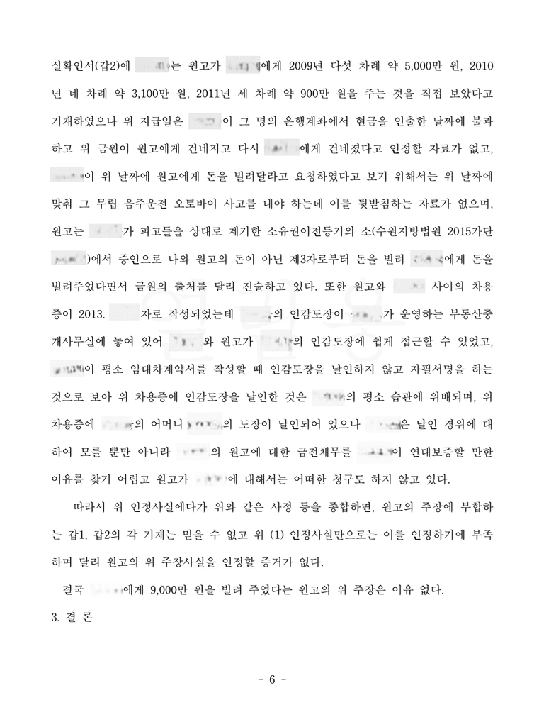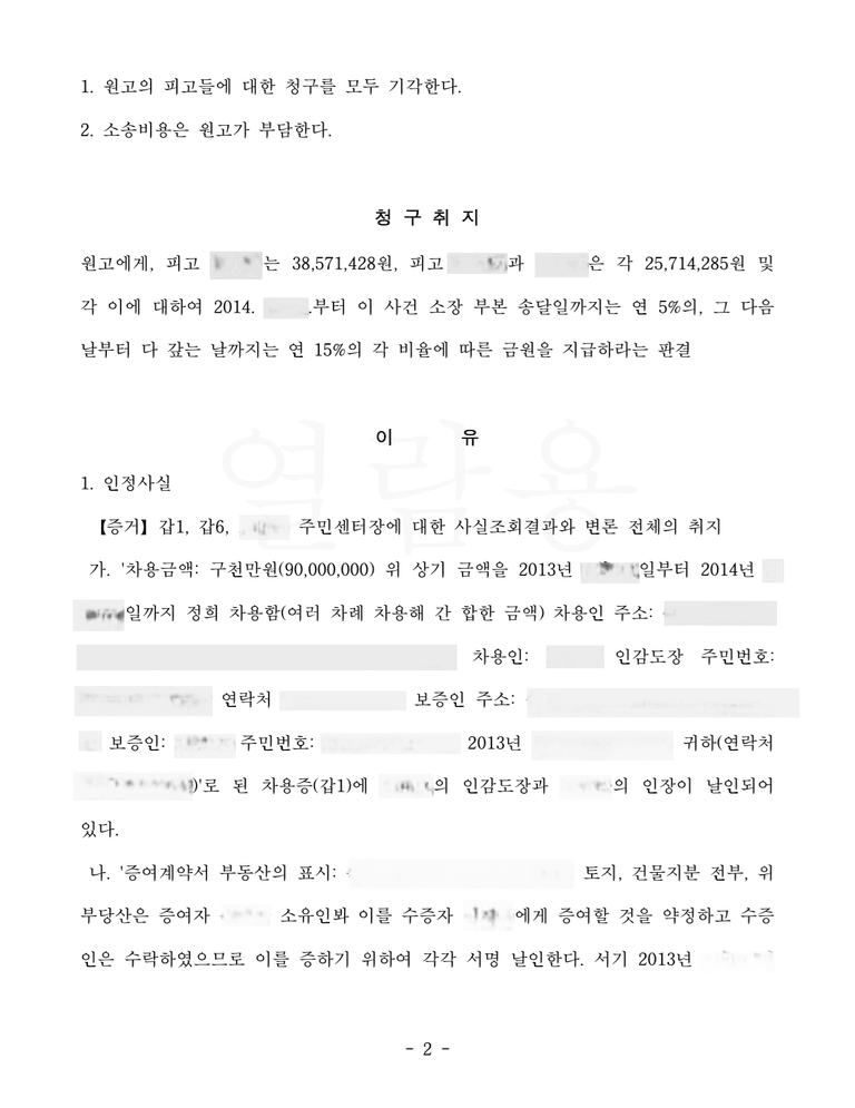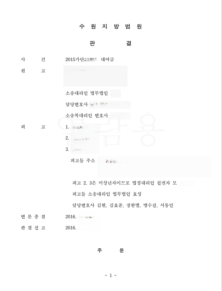 저는 즉각 응소하여 이 사건의 경위, 대여 경위, 차용증 작성 경위 등을 볼 때 차용증이 명의도용/위조되었음을 주장 입증하였고 법원은 원고 청구를 기각하였습니다.