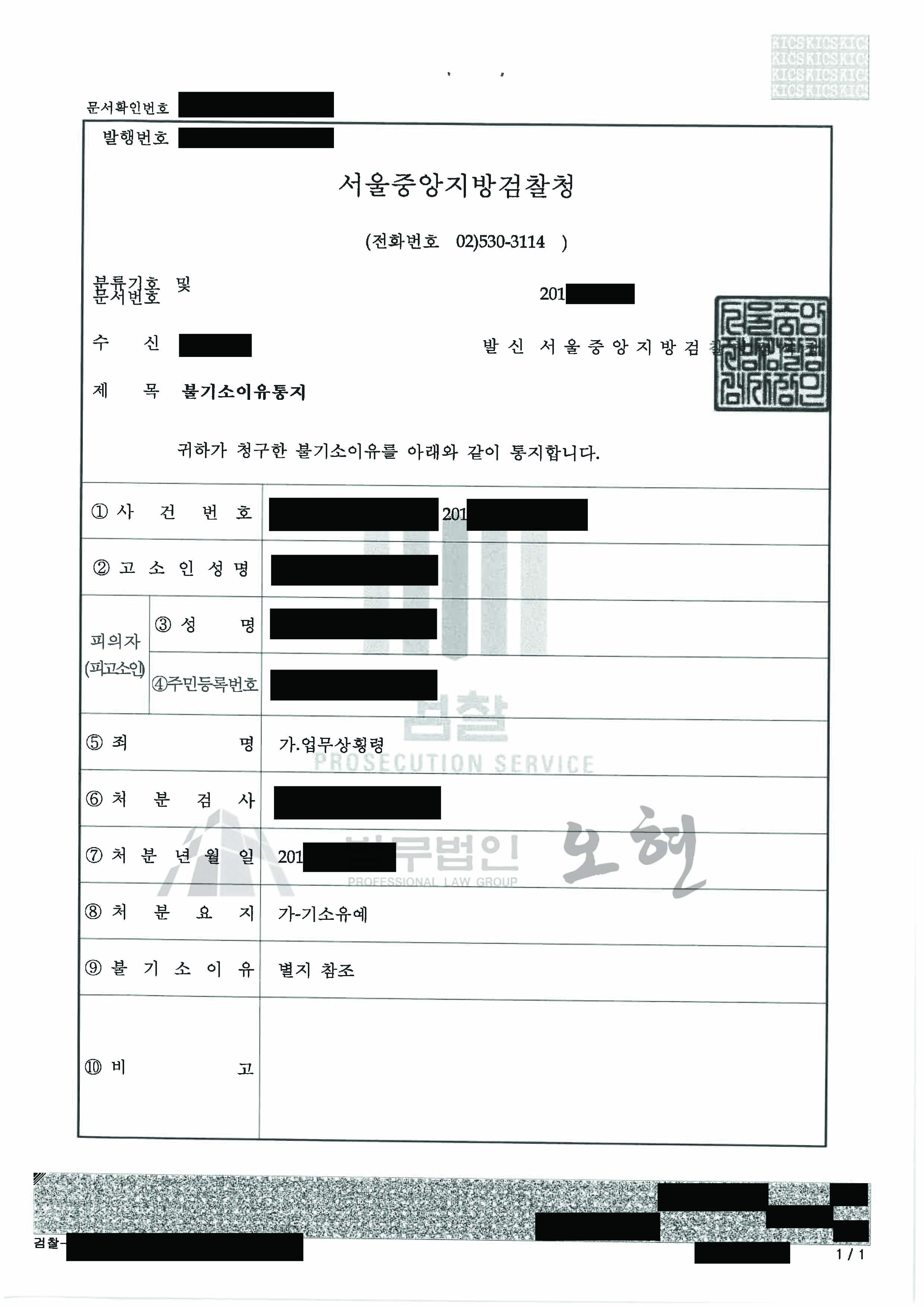 본 변호인은 검찰에 회사측이 작성한 처벌불원서를 제출하는 한편, 의뢰인이 가족들의 생계를 위하여 횡령의 잘못을 저지르게 되었다는 점, 횡령한 돈을 유흥비나 사치에 탕진하지 않았다는 점 등을 정리한 변호인의견서를 제출하였습니다. 그 결과, 담당검사는 의뢰인의 횡령금액이 비교적 고액이지만 정상사유를 참작하여 최종 기소유예 처분하였습니다.