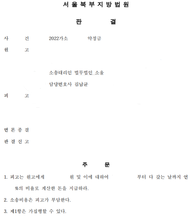 법원은 본 법인의 주장을 받아들여, 피고에게 약정금 지급의무가 존재함을 인정하는 판결을 선고하였습니다.