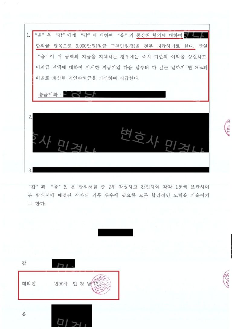 또한, 합의서에는 합의금 지급 지체 시 20%라는 고율의 지연손해금을 가산하도록 하여 이행을 담보하였고, 무엇보다 의뢰인의 명예와 사생활 보호를 위해 비밀 유지 의무 위반 시 1억 원의 위약벌을 배상하도록 하는 강력한 안전장치를 마련했습니다. 상대방으로부터 진심 어린 사과문까지 받아내어 의뢰인의 억울한 마음을 조금이나마 위로할 수 있었으며, 의뢰인은 긴 소송 과정을 겪지 않고 신속하게 사건을 마무리하고 일상으로 복귀할 수 있었습니다.