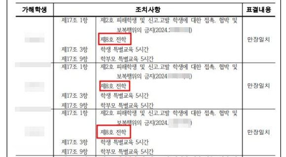 집단 따돌림을 주도한 가해학생 3명 전원은 학교폭력심의위원회의 만장일치로 2호피해학생 신고 및 학생에 대한 접촉*협박 및 보복행위의 금치 처분과, 8호 전학 처분을 받았습니다.