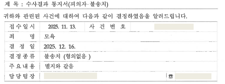 최종적으로 불송치 결정(혐의없음) 처분을 하였습니다. 이로써 의뢰인은 검찰 송치나 재판으로 이어지지 않고, 경찰 단계에서 사건을 종결할 수 있었습니다.