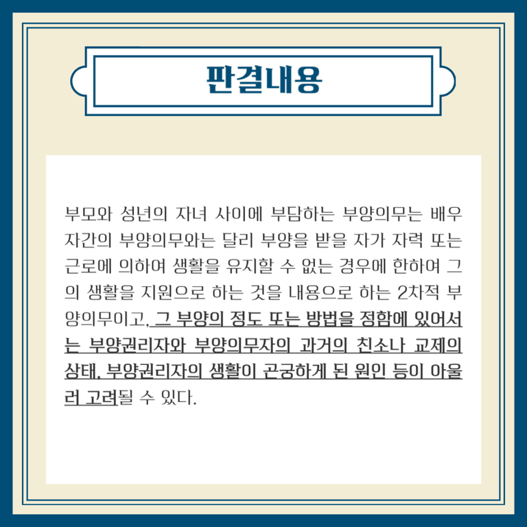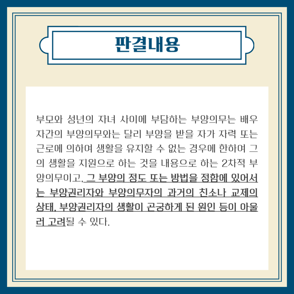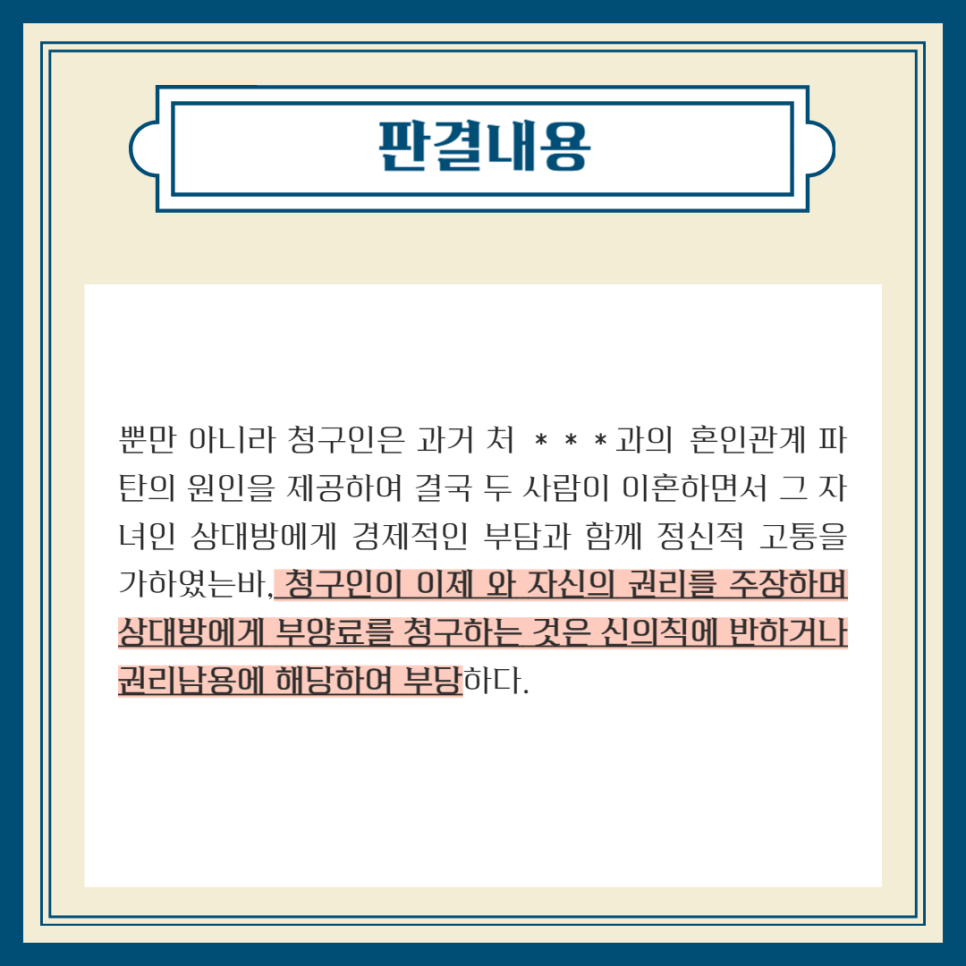 나아가 부양의무를 주장하는 것이 신의칙에 반하거나 권리남용에 해당하지 않을 때에만 부양의무를 인정합니다.