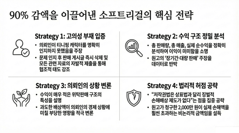 최근 제가 진행한 사건에서도, 원고는 저작권 침해를 이유로 2천만원의 배상을 청구하였으나, 저는 단 200만원만 인정받는 판결, 즉 청구액의 90%를 감액하는 결과를 이끌어냈습니다.