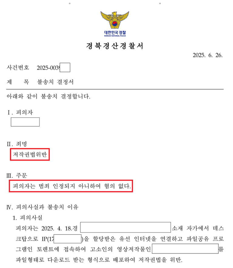 이번 사건은 많은 분께 도움이 될 수 있는 토렌트 저작권 고소 사건 ‘완전 무혐의’ 사례입니다.