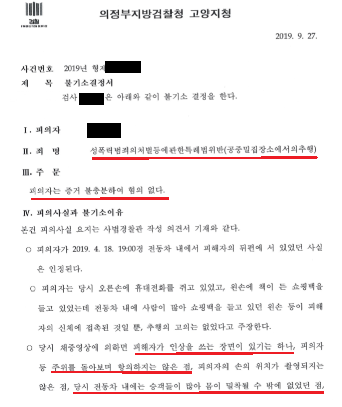 무엇보다도 당시 지하철은 사람이 상당히 붐비고 있는 상태로 어쩔 수 없이 신체접촉이 일어날 수 밖에 없는 상황이었다는 점 등을 적극 주장하여 검찰 단계에서 기소조차 이루어지지 않도록 무혐의 불기소 결정을 이끌어 내었습니다.