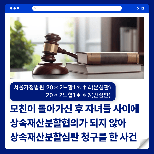 피상속인의 상속인으로 4명의 자녀들이 있었습니다. 청구인들은 피상속인이 병환 중일 때 자주 방문하여 보살폈으나 상대방은 어려서부터 피상속인과 사이가 좋지 않아 절연을 선언하고 피상속인을 찾아뵙지 않았고 이후 피상속인께서 사망하신 뒤 서로 협의가 되지 않아 상속재산분할심판을 제기하였습니다.
