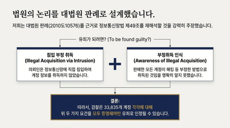 의뢰인은 타인의 계정을 판매하는 잘못을 저지르기는 하였으나, 이 과정에서 ① 정보통신망에 침입하는 등의 방법으로 타인의 계정정보를 취득하지 않았고, ② 타인의 계정 정보가 정보통신망 침입의 방법으로 취득된 것임을 알지도 못하였다.