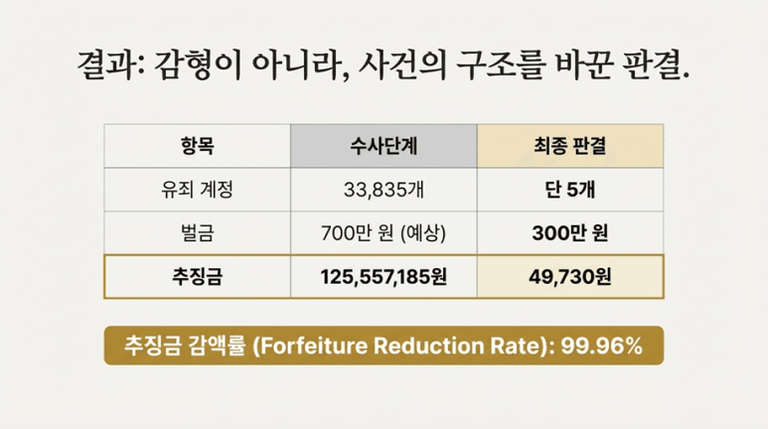 추징금 : 1억 2,555만 원 → 5만 원 방어, 추징금 감액률 99.96%