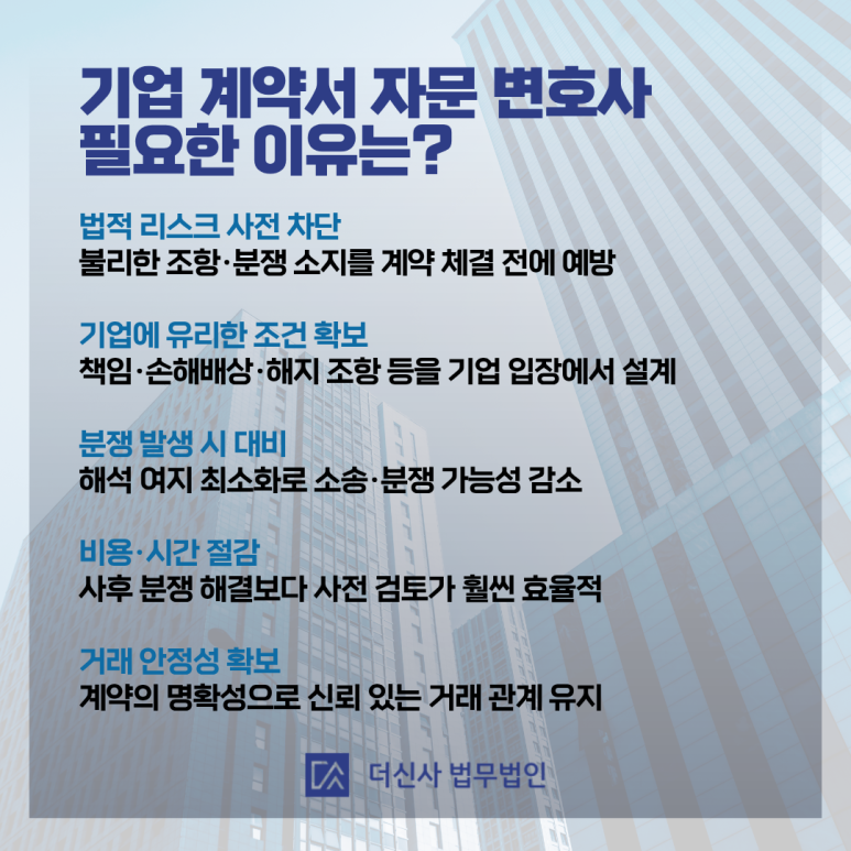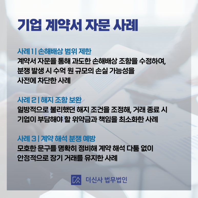 최근에는 개인정보보호법, 전자상거래법 등 기업이 신경 써야 할 법령도 계속 늘어나고 있어, 계약서 하나라도 전문가의 검토 없이 진행하는 것은 상당한 위험을 안고 가는 것과 다르지 않습니다. 한 번 제대로 정비된 계약서는 이후 수년간 기업을 보호하는 방패가 되어줍니다.