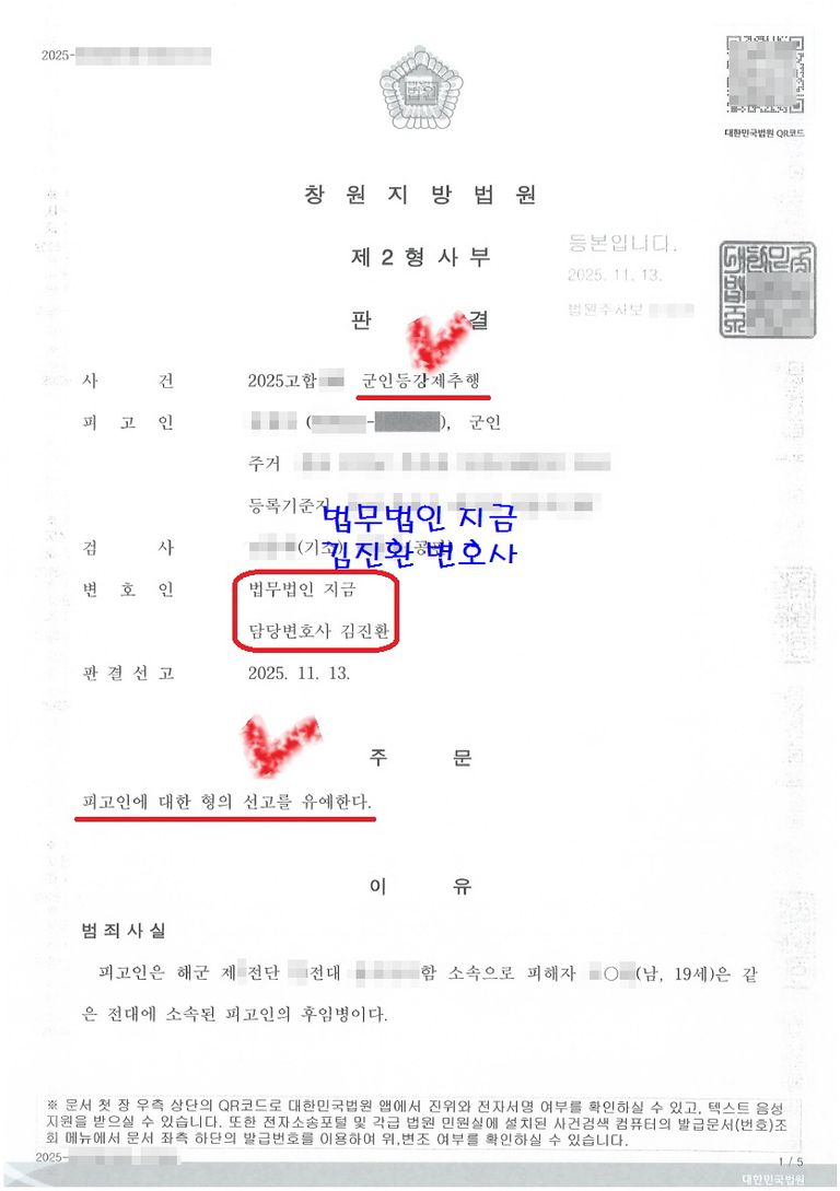 의뢰인의 행위가 군인등강제추행에 해당함은 명확했지만 상대적으로 경미한 편에 속해 기소유예를 기대할 수도 있는 상황이었으나 피해자가 합의를 하지 않겠다고 하여 창원지방법원에 기소가 되는 것을 막을 수는 없었습니다.