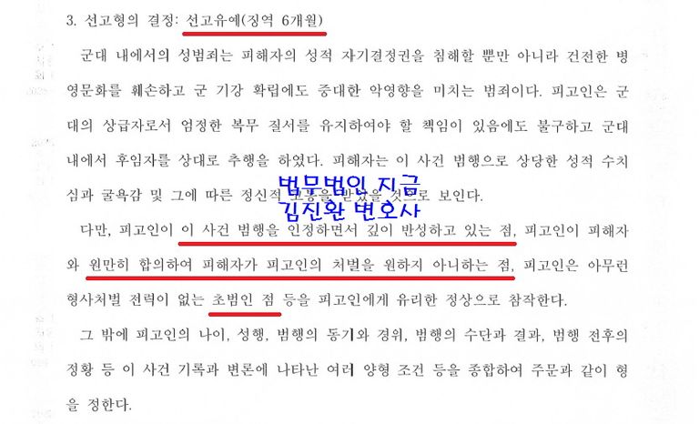 ○ 범죄사실 : 다른 선임병이 피해자를 일시정지 하게 하는 가혹행위를 하자 이를 이용하여 피해자에게 다가가 피해자의 바지 위로 성기 부위를 4~5초 정도 문지르듯이 만짐