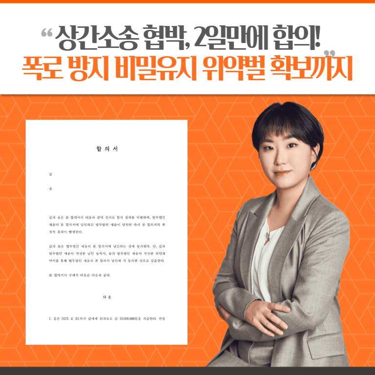 그러나 의뢰인께서는 확실한 금지를 위하여 위약벌을 1000만 원으로 올리고 싶어하셨고 이를 수정하여 상대방분께 전달드렸으나 갑작스레 합의를 하지 않겠다고 하셨습니다. 바로 전화드려 설득하고 위약벌 300만 원으로 하는 대신 1회만으로도 큰 위험이 따를 수 있는 비밀 누설 금지에 대하여는 1회가 아닌 알게 된 1인당 위약벌 300만 원으로 작성하여 의뢰인 보호를 위해 최선을 다하였습니다. 빠른 진행을 원하셔서 2025. 3. 26. 최종 합의서가 완성되어 등기 보내드릴 수 있었습니다.