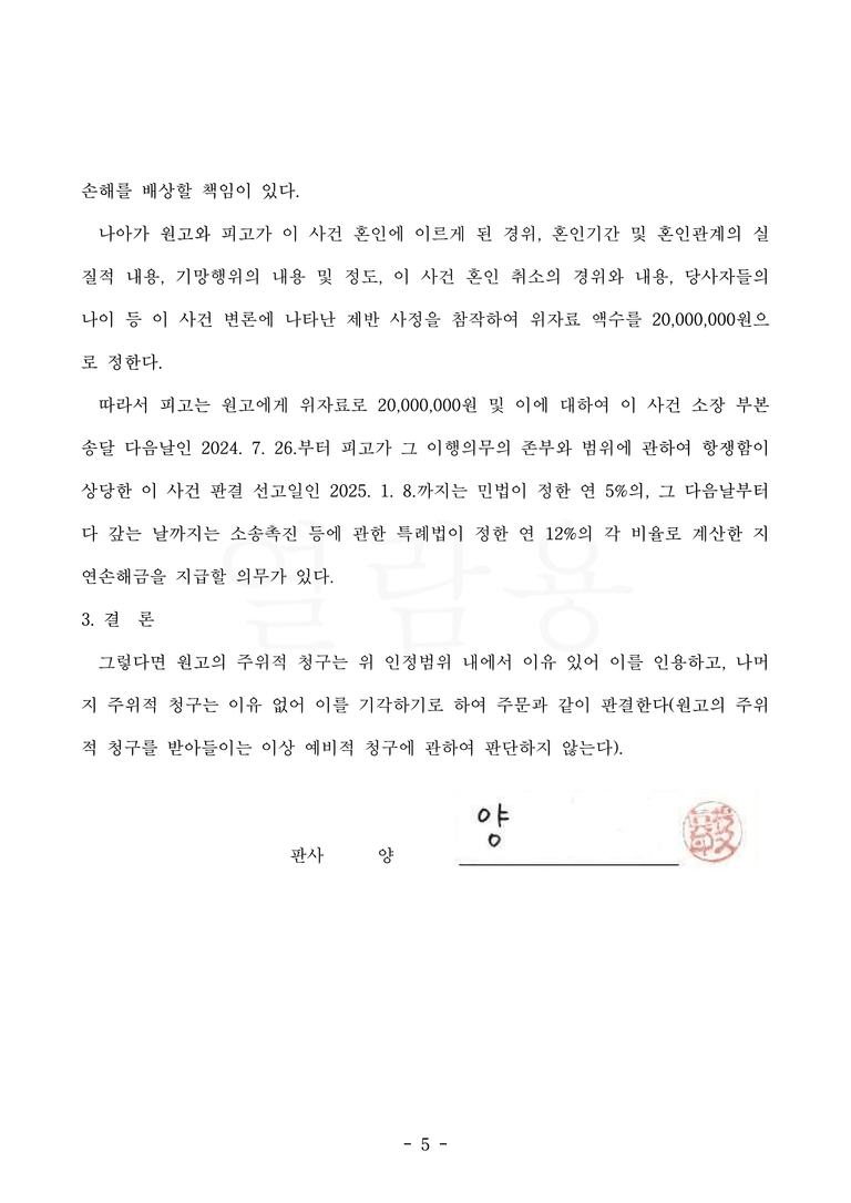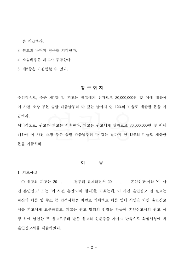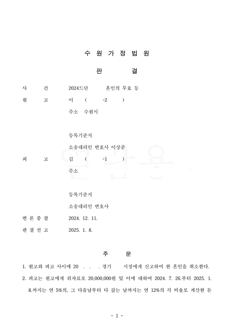 나. 결과 : 혼인취소 성공,위자료 2천만 원 지급받음