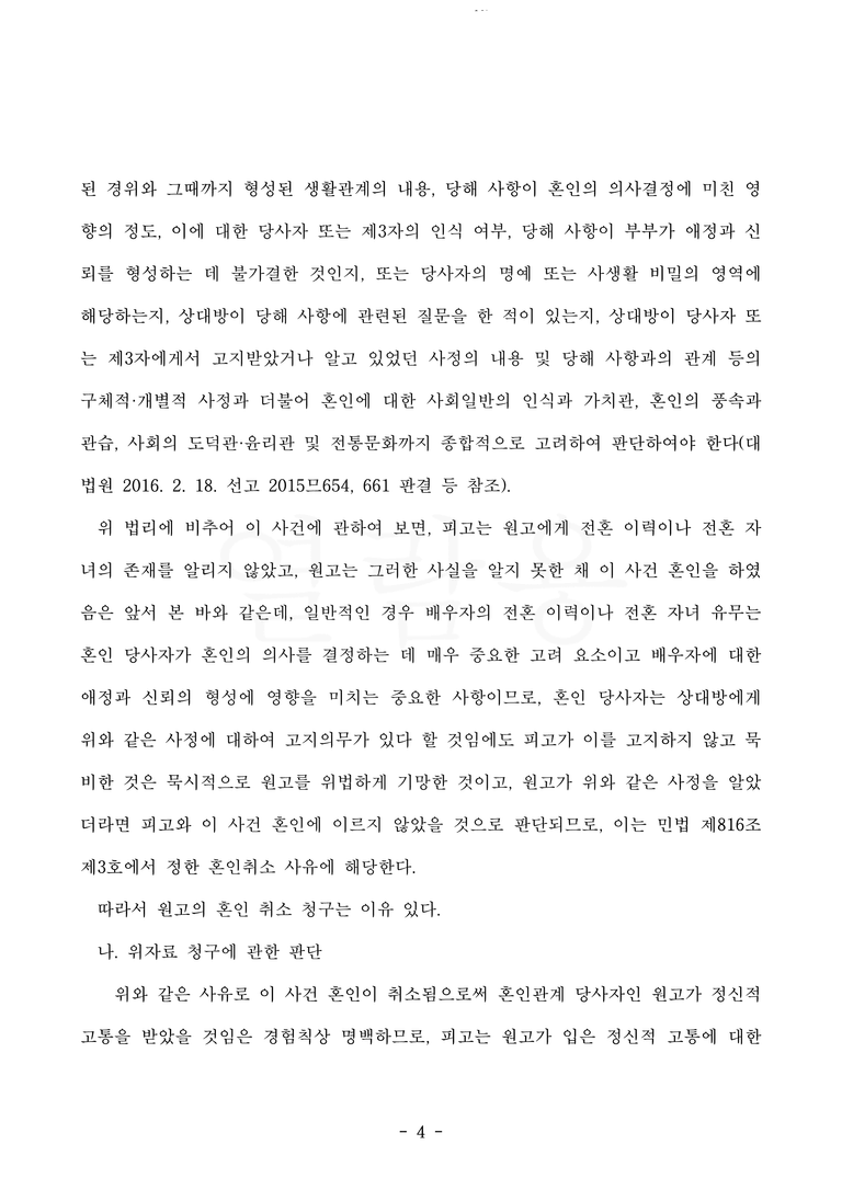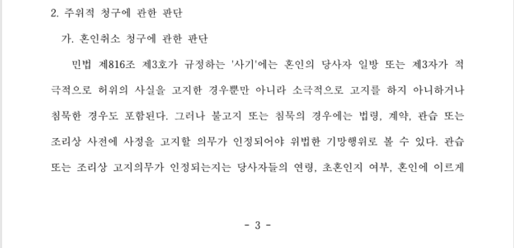 남편은 혼인 경력, 자녀 유부를 말하지 않은 것이 사실임을 인정하였습니다. 그러나 남편은 자신이 결혼 경력 등을 말하지 않았다고 하더라도 위자료를 지급할 의무는 없다고 주장하였습니다.
